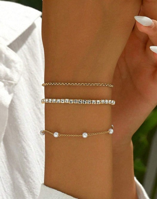 3pcs Set Fashionable, Elegant & Graceful Silver Metal, Plastic Rhinestones & Pearl Stretch Bracelets, Adjustable Size Suitable For Daily Wear, Great Gift For Girlfriend, Wife, Mother, Family And Friends, Birthday Or Anniversary