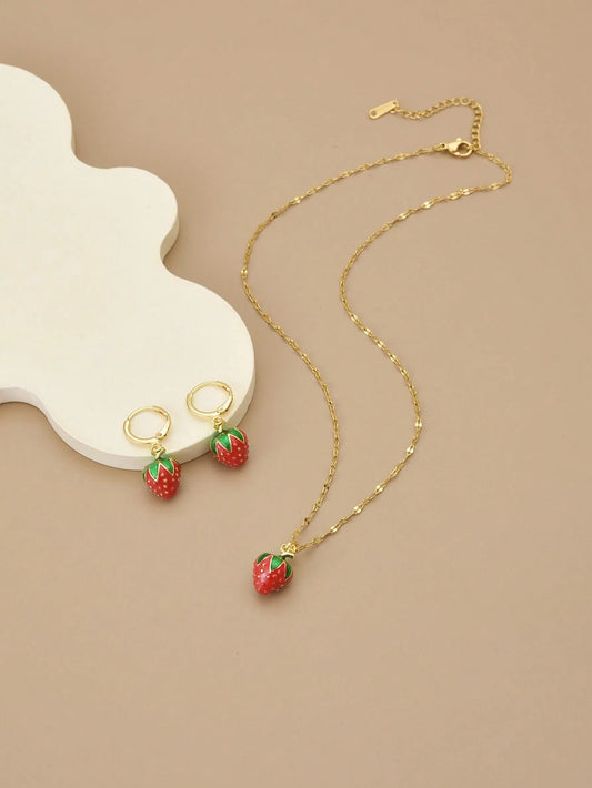 1 Set Red 3D Strawberry Stainless Steel Elegant Necklace & Earrings For Women
